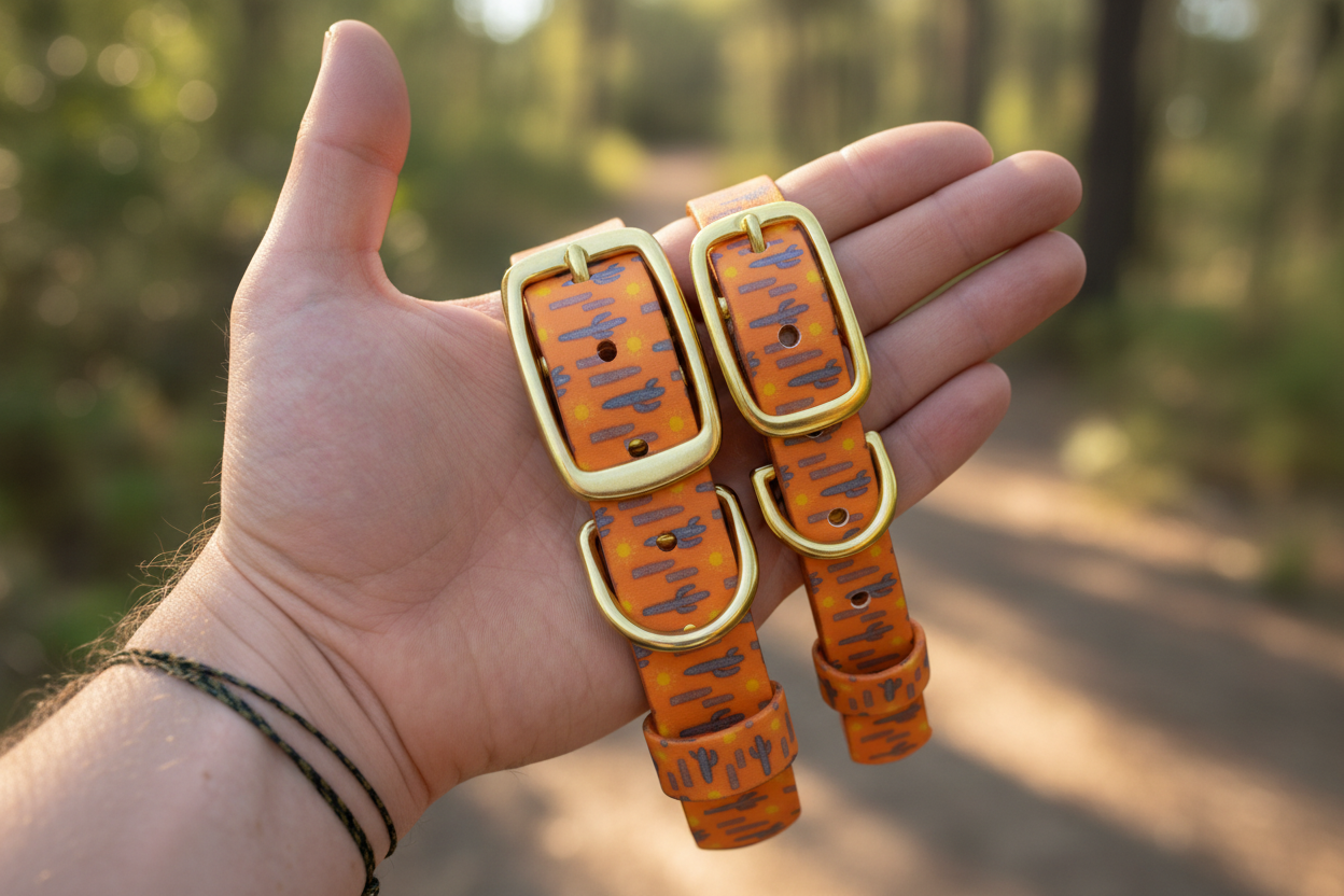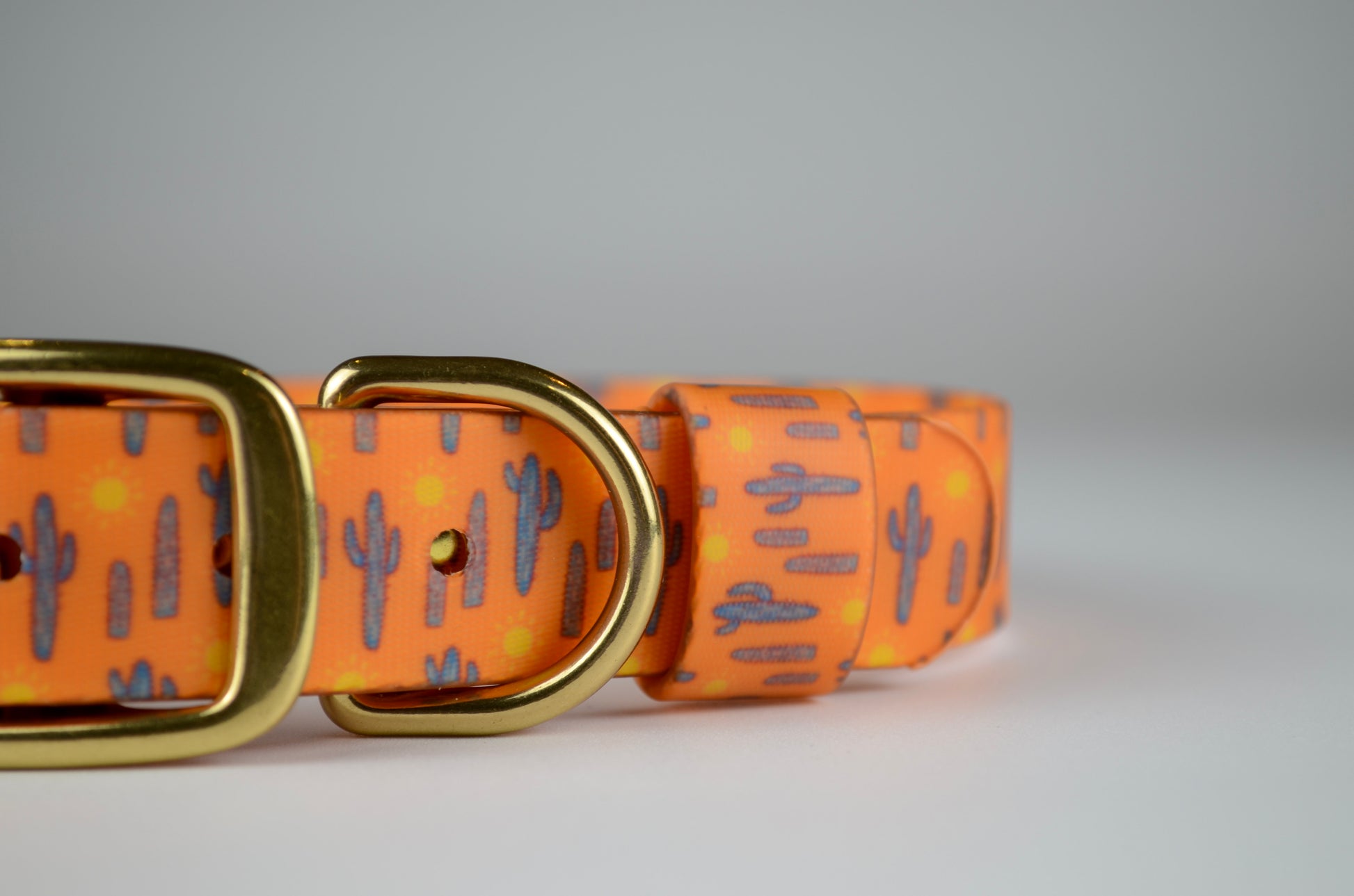 Each custom pattern is printed onto polyester webbing then coated with transparent PVC rendering them highly resistant to fading, waterproof and best of all, stink proof. Our collars and leashes repel moisture, dirt, and odors so your pup can play freely.